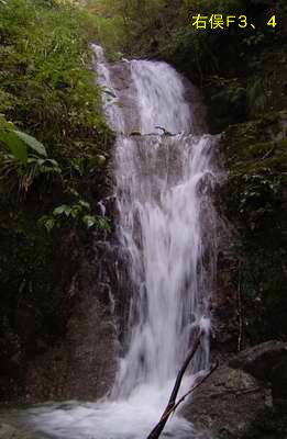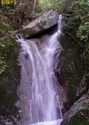 F2の落ち口の上に大きな岩が乗っているので見栄えはイマイチだが、白い石英閃緑岩が水に磨かれて輝いている。