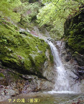 ナメはV字状のせまい谷間を関にしたような2m程の小滝につながる。