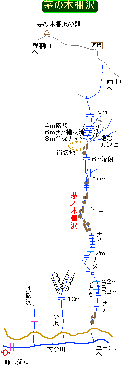 本厚木5:18〜新松田5:55〜玄倉6:40〜ユーシン〜熊木沢ダム8:30〜オガラ沢出会から戻って、小沢へ〜茅の木沢出会い9:25〜滝場10:10〜登山道10:40〜茅の木棚沢の頭10:45〜鍋割山11:20〜後沢乗越〜二俣〜大倉12:30〜山岳SC〜大倉13:08神中バス〜渋沢〜本厚木〜自宅14:00頃 棚の状況が「