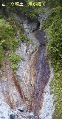 その中に消えてしまっているように思える水の流れは、滝の下まで行けば分かるが、崩壊して落下した岩の所で、小さく右に方向を変え、滝になって上方に延びている。