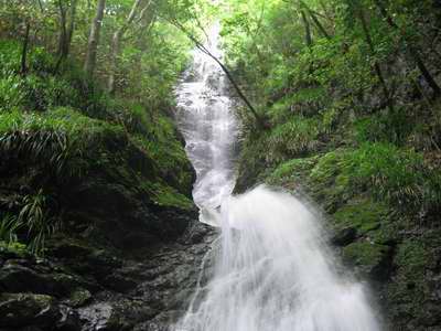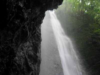 本体の滝の他に、上流から引かれている用水溝からも満々の水が溢れ第二の滝となって、窟の中には本体のゴンゴンと落ちる水流に第二の滝が水のカーテンとなって加わり、水の中を二匹の竜が口から火噴流ならぬ水噴流をはき続けているが如くに水が交錯して、神秘のエネルギーを空間に満たし、空間中に立ち入る者にパワーの一端を分け与えてくれるような気がする。