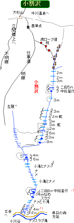 自宅6:30〜本厚木6:51〜松田7:23JR〜谷峨7:50富士急バス〜玄倉8:10〜立間橋8:30〜小割沢8:40〜二俣9:35〜左俣へ9:35〜虎ロープ(沢から尾根へ)10:10〜境界杭10:15〜尾根に合流10:20〜大杉山山頂10:30〜立間橋上の湧き水のある位置の尾根を末端まで下る11:00〜湧き水で水浴び11:10〜玄倉発電所上(あの事件の場所確認 何人も亡くなったに現地に慰霊碑のかけらも無いのを哀れに思う)〜玄倉11:40(カヌー遊びのお子立ちがたくさんいました)〜神縄〜滝口滝見物12:10_40〜谷峨まで歩く13:25_14:03JR〜新松田14:23〜本厚木14:50(ちょいと本屋で暇つぶし)〜自宅15:50 2009/07/04 朝方霧状の雨があったが、山では薄い雲、日が差すような天気で山遊びには最適な一日だった。