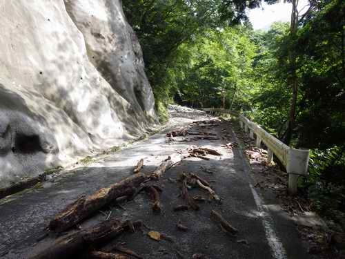 現時点で鎖を開いて通行できるのは林業関係者の車両のみだが、路上には先週前の大雨に数え切れないほどの流木が流れてきた方向を示している。
