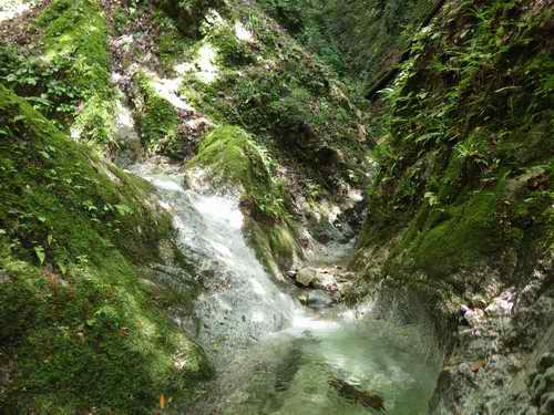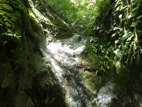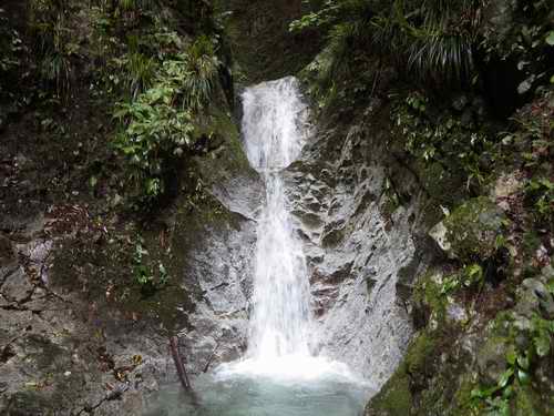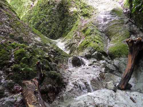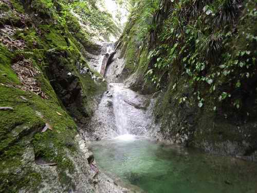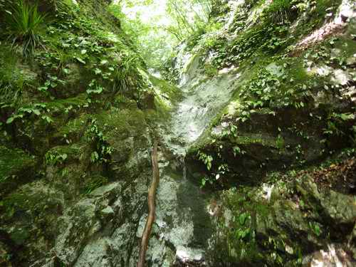 周囲を苔の付いた垂直な岩が覆っていて滝以外に進む方向がない。
