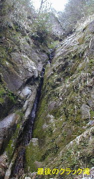 ナメを過ぎると正面に水が滴り落ちる40mかという涸滝が出てきて、沢はそこで小さく左曲して樋状となる。