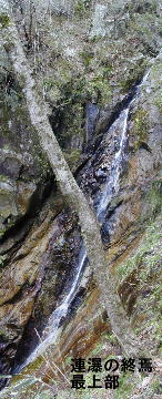 下には先程の大滝の落ち口が見えるが、右の疎林帯に入って10m程おりて、やっと沢に戻る。