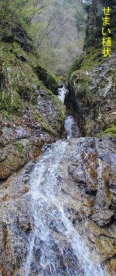傾斜は50〜60度というところだから、それほど急でもないが、幅は一人が通過するのに精一杯という所なのに、樋が深く両岸が切り立っているので、下からは見上げるような感じになる。