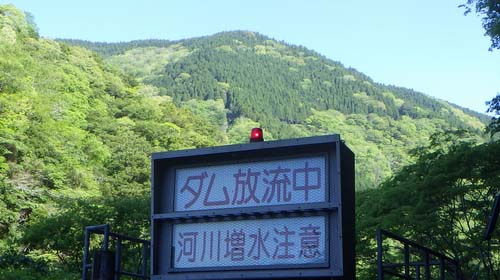 正面に林道上にアッチ沢の滝が水を落としているのが見え、玄倉川の左カーブを曲がった正面には解放されたダムゲートからは5m二段の砂防堤様なって川幅一杯に水が落ちる。