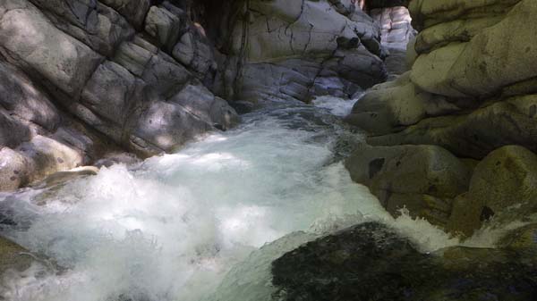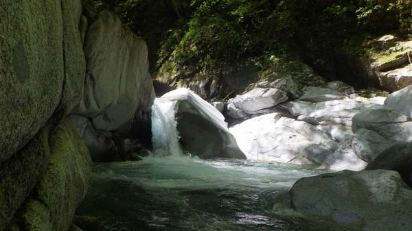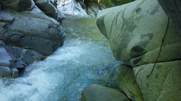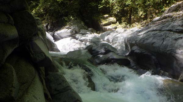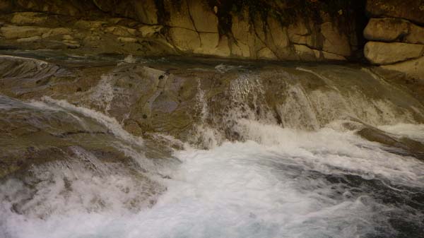 その先では左岸側から右岸(外カーブ)に一旦移り、小さな段差を構成する岩場伝いに10m行ったら再び左岸側に戻る。