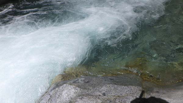 川底は強い流れに抗して止まる大きさの丸石が詰まって敷かれ、水流幅は3〜4mに狭まり、水深は膝の上程度だが、流れる水は運動エネルギーを受けて膝上から腰の辺りに駆け上がり、そのような状態で片足を上げると圧力で体を元に戻すこと出来なくて流れてしまう。