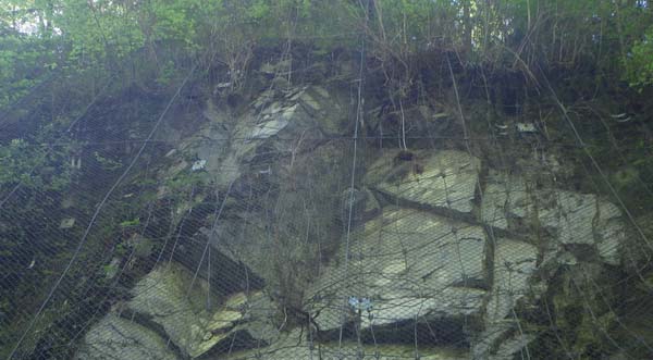 そこは以前より落石防止鉄綱が被されている所であり、その網そのものに大きな破れはないがようだが、鉄網は小岩の剥離が直接林道に落ちないようにする機能はあっても岩盤崩落の場合の落石などは1受け止める機能はないし、また岩盤毎の剥離落下を防ぐ機能も持たないのは明白だ。