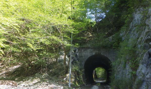それにどこから乗ろうかと玄倉林道をぶらぶらと、隧道を一つ通り抜け、二つめの隧道入り口手前からの踏み跡道に乗り、隧道横二軒の作業道具小屋の空っぽを覗き、隧道の真上から前後の林道を眺める。