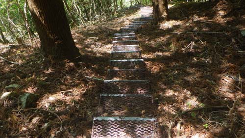 その送電鉄塔を二つくらい通り過ぎたところの樹脂板階段と鎖手すりに、これは登山道ではないと気がついたが、今更戻るのも面倒だし、それに送電鉄塔が何処に伸びていくのかは分かっていないが、悪くても秦野峠方向でいずれかの林道に出るであろう。