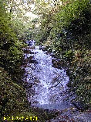 滝下の台地に立って見える二段に落ち込む滝の下の段は、右からも左からも目だけで十分に登るルートを追うことが出来る。