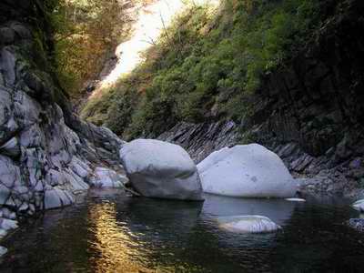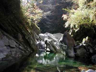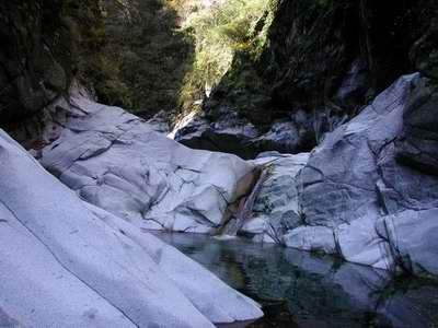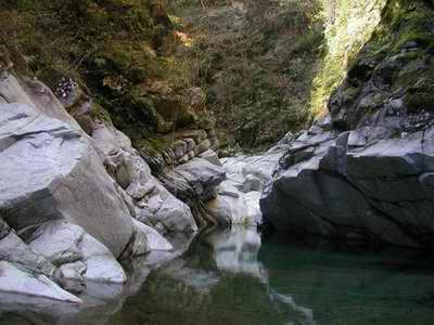 ただし石英閃緑岩ですべてが覆われた岩肌には浸み入る溜まり水は少なく、岩と岩の間は満々と水をたたえた瀞になっている。