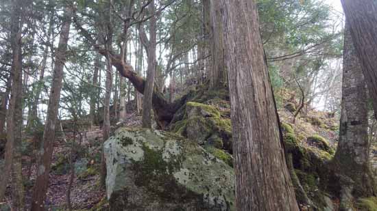 露岩に根を下ろした馬酔木、石楠花の固い枝が直進を防ぐが、そういったところは軽く手で払い、露岩を回り込んで進む。
