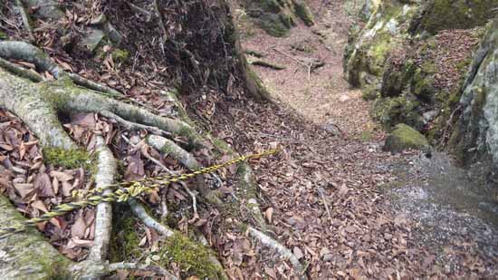 その鞍部には右手から登ってくるガリー状(鉄砲沢と茅野ノ木沢の中間にある小沢の詰めになっている)があり、トラロープがセットされている。