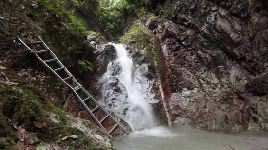 アルミ製梯子が滝横の岩にもたれかかっている小滝は滑り感の少ない流水中の岩を登って気分が良い。