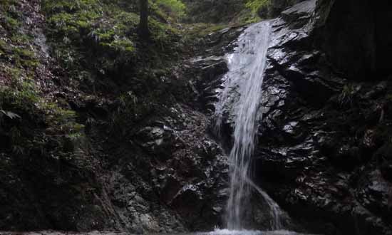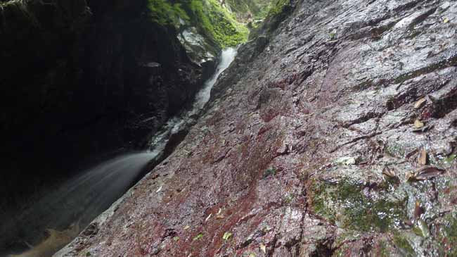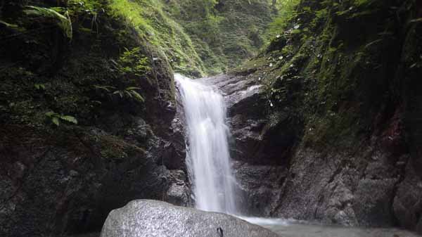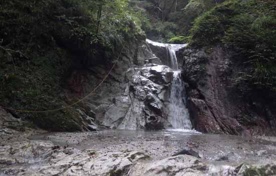 右岸に水沢が入り、本流は6m程の緩い滝(左岸に虎ロープ付き)となり、水流左を半ば水に入りながら軽く登る。