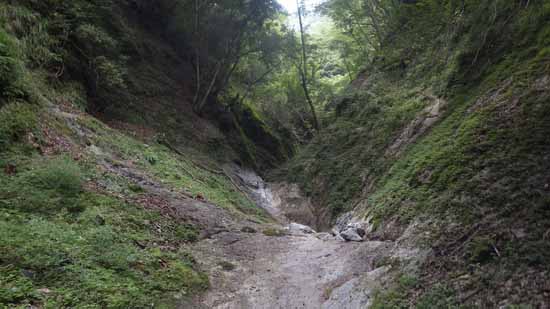 沢の中に戻る直前に、先ほど登ろうとした樋状の次の涸棚の落口らしいのが下方遠くに見えた。