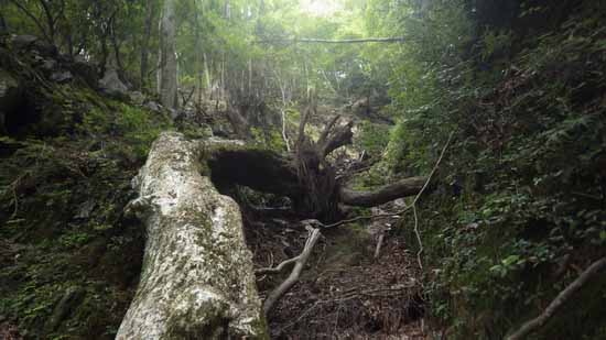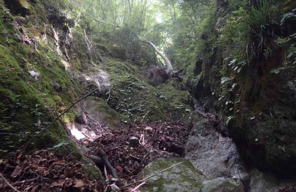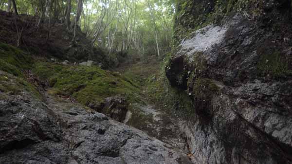 それも短く終わり、ゴツゴツ方形をした岩が10mほど短くあって、そこで沢形状は無理なく斜面中の立木帯に連絡する。