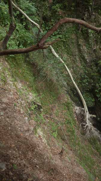 前はしっかりしていた道だったが、最近は砂が流れ荒れてきていて、あそこ、落ちたら沢床まで10mでは利かない高低差があって結構危なっかしく見える。