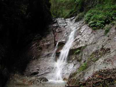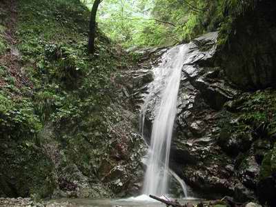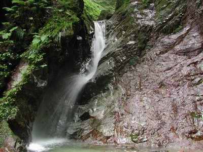 玄倉から歩き、40分ほどで弥七沢出会いに着き、砂防堤を越え、観望廊(鉄製)を通って沢に戻ると出会いの道路の上からも見える最初の滝5mにつく。