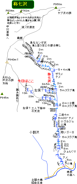自宅6:16バス〜本厚木6:36〜松田7:23JR〜谷峨7:46バス〜玄倉8:10〜弥七沢出会い8:45〜ヒョングリ滝9:00〜沢登りパーティに会う9:45〜間違った左俣?出会い9:50〜洞穴10:15〜小尾根に出る10:30〜P840?10:35〜P956m10:55〜湯ノ沢ダム12:00〜中川温泉入り口12:13バス〜谷峨12:57JR〜13:16小田急〜自宅14:20頃 20060716 山の中では雨がぽつりぽつり 時々は雨脚が速かったが、山をはずれると薄日も射していた、この時期としては歩きややすかった一日でした。