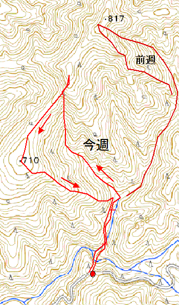 自宅6:10〜唐沢林道丸淵横7:30〜丸淵・一の宮沢分岐7:55〜一の宮沢〜稜線8:15〜P710m8:20〜一の宮沢右岸尾根〜一の宮沢分岐8:35〜丸淵〜自宅9:55 20210501晴れ(午後雷)