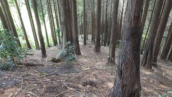 杉の植林帯の中にマークテープや道界杭は全くないが、薄み跡は所々で分かれてはいても道跡は切れることなく続く。