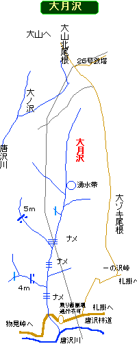 大月沢は唐沢林道を柿木平から物見峠(隧道)を経て、小唐沢橋から札掛側に300m程の先にある。