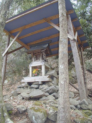 自然石に「山の神」と刻まれた石碑は屋根がつけられ、前には小さな祠が共に鎮座し、綺麗に清掃され、数日前に花も生けられたようだ。