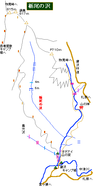 その歩廊沿いにあって、鍋嵐を見上げ、本峰とP710mに挟まれた唐沢川に降る小さな窪みが栃尾の沢で、それは、唐沢キャンプ場からは風穴沢を過ぎ、堰堤をこし、歩廊を10分程行った所で小さなナメの上に対岸に落ち込んで来る。