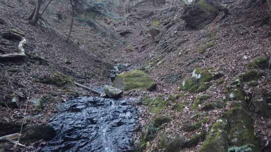 直ぐに一本分岐して、そこから百mでもう一本が分岐して、そこから百mで沢が左に曲がるとラストの経路は沢を突っ切って斜面を30m上がるのだが、この道は人用には使われて無く、昨今は獣専用だから経路とは言わないかも知れない。