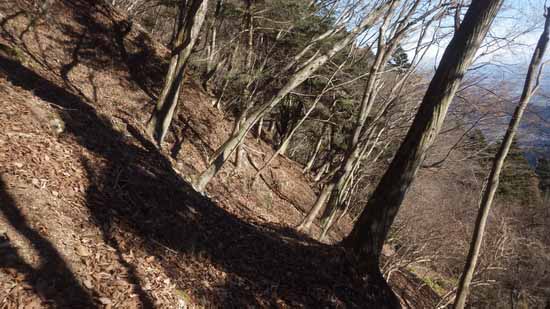 道は基本としてやや下り勾配に(三峰側から)ほぼストレートに伸びるが、途中の崩落帯で小さく折り返すところの見極めが不確かだが、困ったら目を細めてさぐればトラロープが見つかったする。