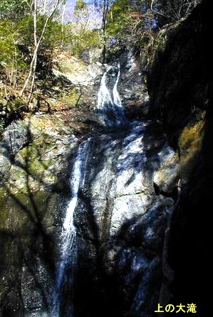 下部は幅広傾斜度75〜80度8m、上部は65〜75度10〜15mというところか、日の光をきらめかせて水は二条に別れて流れ落ちる。