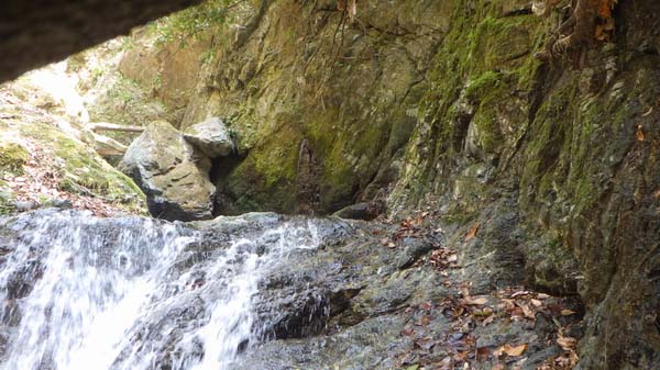 それで一段目を終えたら続きの滝は登らずに、水流を左に渡り左の岩稜から巻いてボウツクリ滝の下に出る。