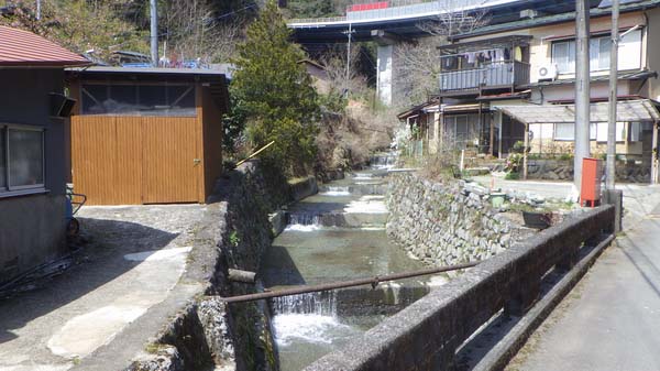 向河原バス停で降りて吊り橋を渡ってT字に突き当たる。