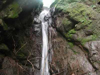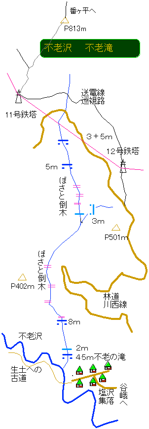 塩沢地区の不老滝は先ほどの最奥の家から50mも行かない不老沢の左岸が細く裂けた50m程奥に立っているのが山道から見える。