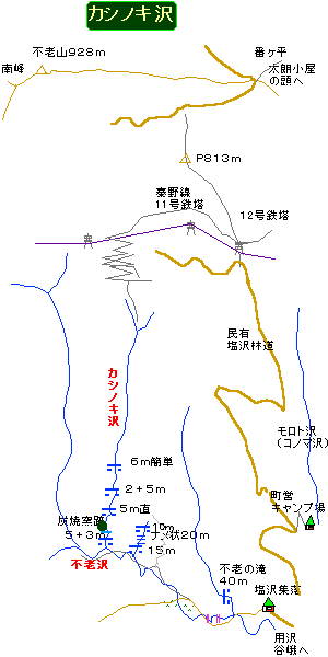 日地2000年版地図には不老沢は中流で二つに別れ、奥の方が不老沢、手前の方には「カシノキ沢」って書き込まれている。