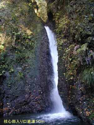 降りきった所は、そそり立った両岸にはさまれ狭くなった中に水が集中して落下する10mの直瀑の手前だった。