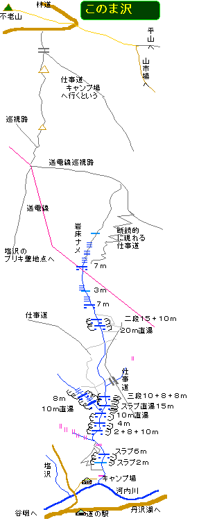 水の流れを追っかけると、10m滝の上の水の流れは直接15のスラブm滝に来るものとは別に一本の流れがあり、