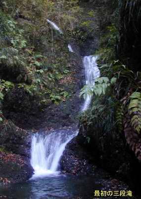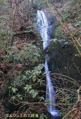 灌木が邪魔して、はっきり見えないが、下から10m、8m、8m位と続く三段の大滝だった。