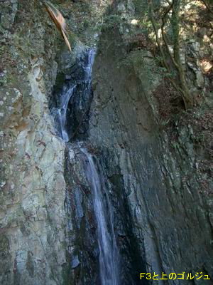 3m滝と、この滝の中間部の右岸に上昇するバンドがあり、不安定な草付きの枯れ草と枯れ葉を払い、足場を確認して落ち口に続く平坦な岩場に立つ。