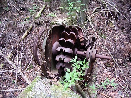 滝手前の小窪には滝上から導かれた水管と小型ペルトン型水車(回転径Φ25インチ程度)が静かに土に帰る時を過ごす。