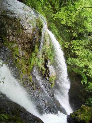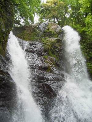 二条に別れた滝は豊かな水の勢いのままに吹き出し落ちる。