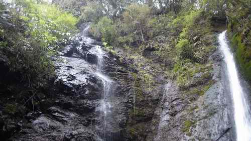 もしも、段と段の間に立ちたいなら、巻き道に入って一段目の落ち口高さまで登ると、そこから滝に入っていけるバンドがある。