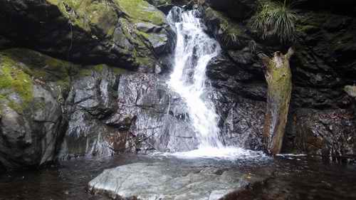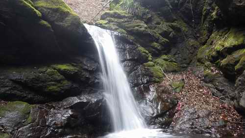 ゴツゴツした黒い岩の上に水量が細く流れる。