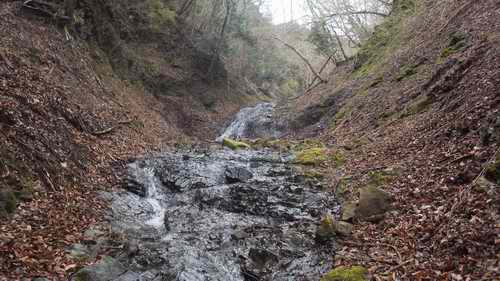 それは岩場の上方二十mほど上を通過する集落への引水用溝に枯葉が詰まって、それで止められた水があふれて行き場無く飛沫になって落ちているのであろう。
