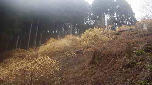 枝打ちされて落ちた枝が足に絡んで一歩一歩が歩きにくい。苫道・踏み跡らしいのをつないでともかくも登っていくと、上方に三椏の群生が見えてきた。